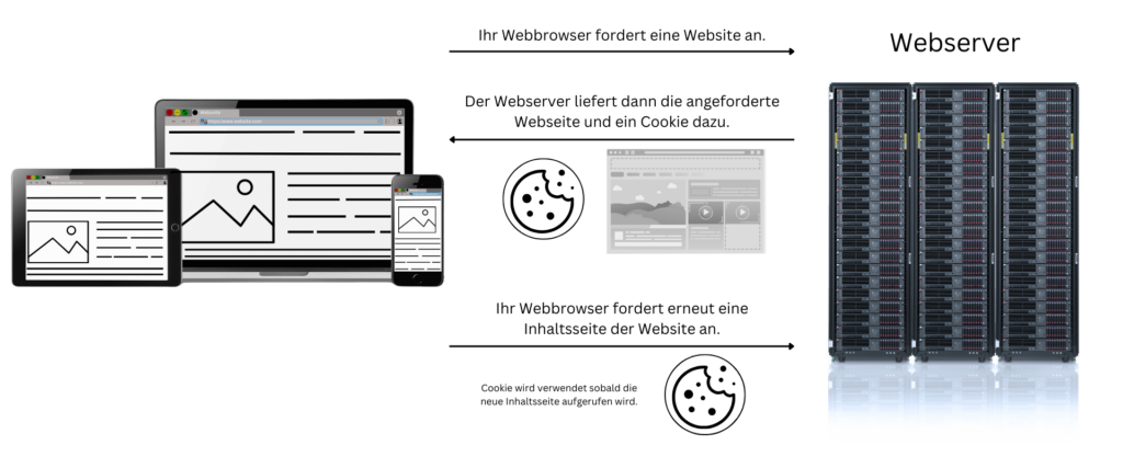 Mit der folgenden Grafik erhalten Sie eine Veranschaulichung, wie die Interaktion zwischen Webbrowser und Webserver bei der Verwendung von Cookies abläuft. Der Webbrowser sendet eine Anfrage an den Server, der daraufhin ein Cookie zurückschickt. Dieses Cookie wird im Browser gespeichert und bei weiteren Anfragen an die Website genutzt, um Informationen zu übermitteln und personalisierte Inhalte bereitzustellen.